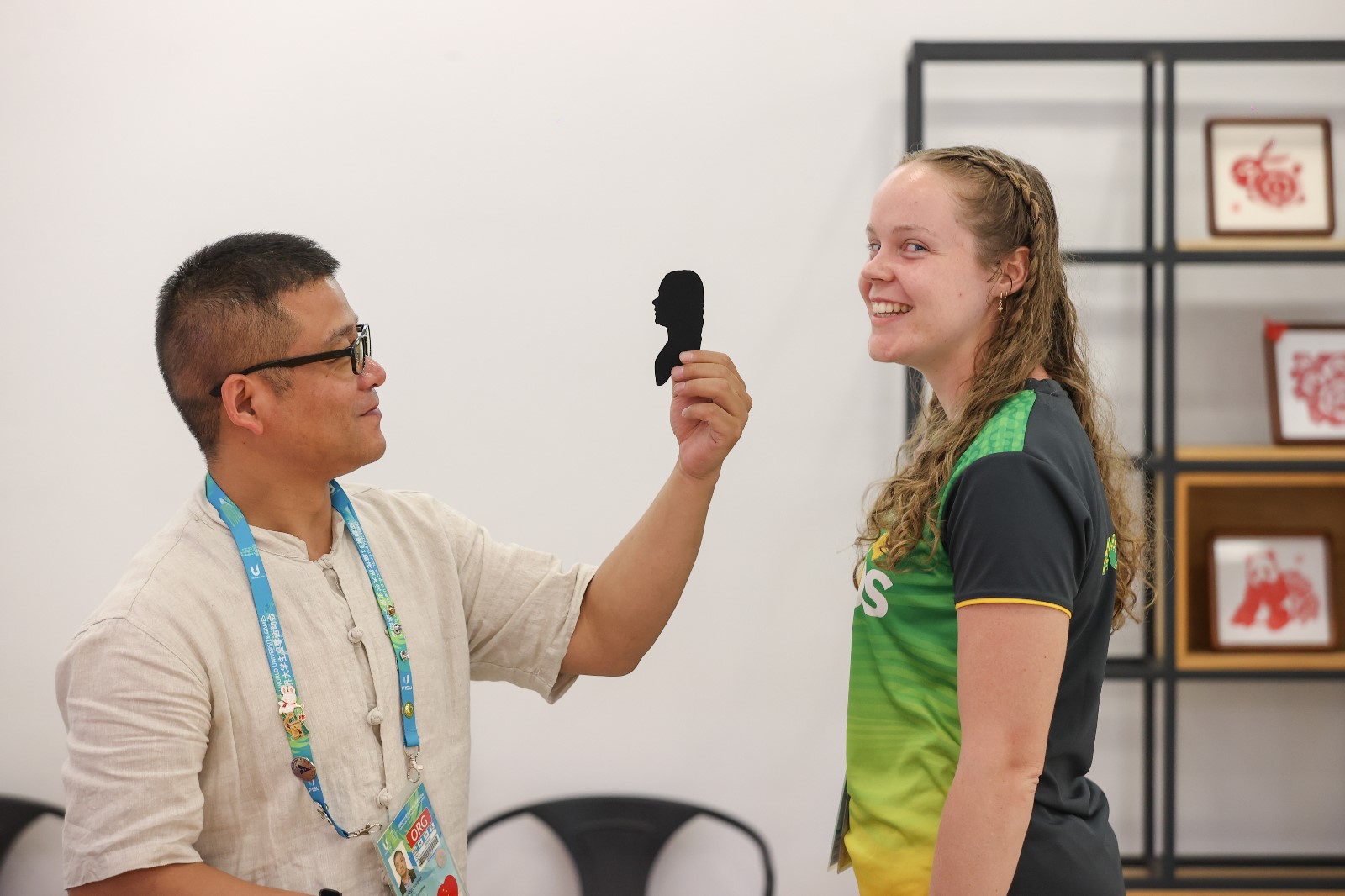莊叢燦的剪影作品和其耐心負責的剪紙教學倍受運動員們“點贊好評”的同時,也吸引了國際大體聯和各國代表團人員前來“沉浸式體驗”。期間,莊叢燦為國際大體聯代理主席雷諾·艾德和意大利代表團官員彼得羅·伊瓦爾迪進行剪紙教學和剪影留念。