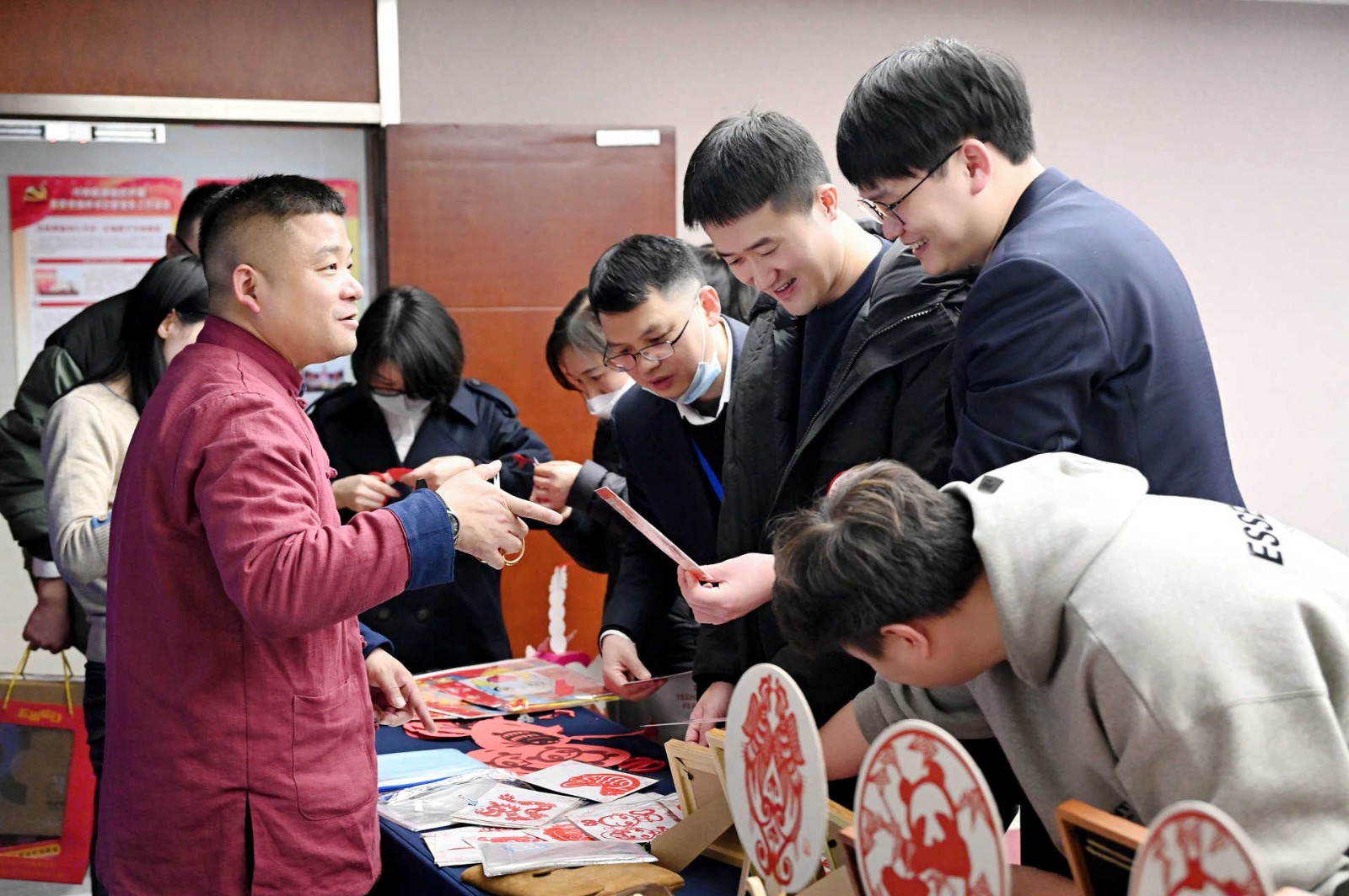 此次活動采用游園方式,現場設置了民俗體驗區、非遺手作區、民俗體驗區、新春互動區、游戲互動區等5個活動區域,涵蓋猜燈謎、剪窗花、做龍燈、滾滾樂等8個活動。活動現場每一處都用心裝扮,火紅的中國燈籠、精美的傳統對聯伴隨濃郁的新年味道彌散在會場的每一個角落。大家爭先恐后、玩勁十足,盡享新春的熱鬧與喜悅!有的圍著掛著紅線繩的燈謎卡片,仔細閱讀謎語,認真思考,沉浸在猜謎的樂趣中;有的圍在四川剪紙非遺傳承人莊叢燦老師周圍,一邊聆聽著剪紙的技巧,一邊仔細修理邊角,用心精雕細琢;有的在學習制作龍燈,他們展現出極高的熱情和創造力,根據自己的想象,給龍燈增添了各種裝飾,如彩紙、亮片等,使得每個龍燈都獨具特色。