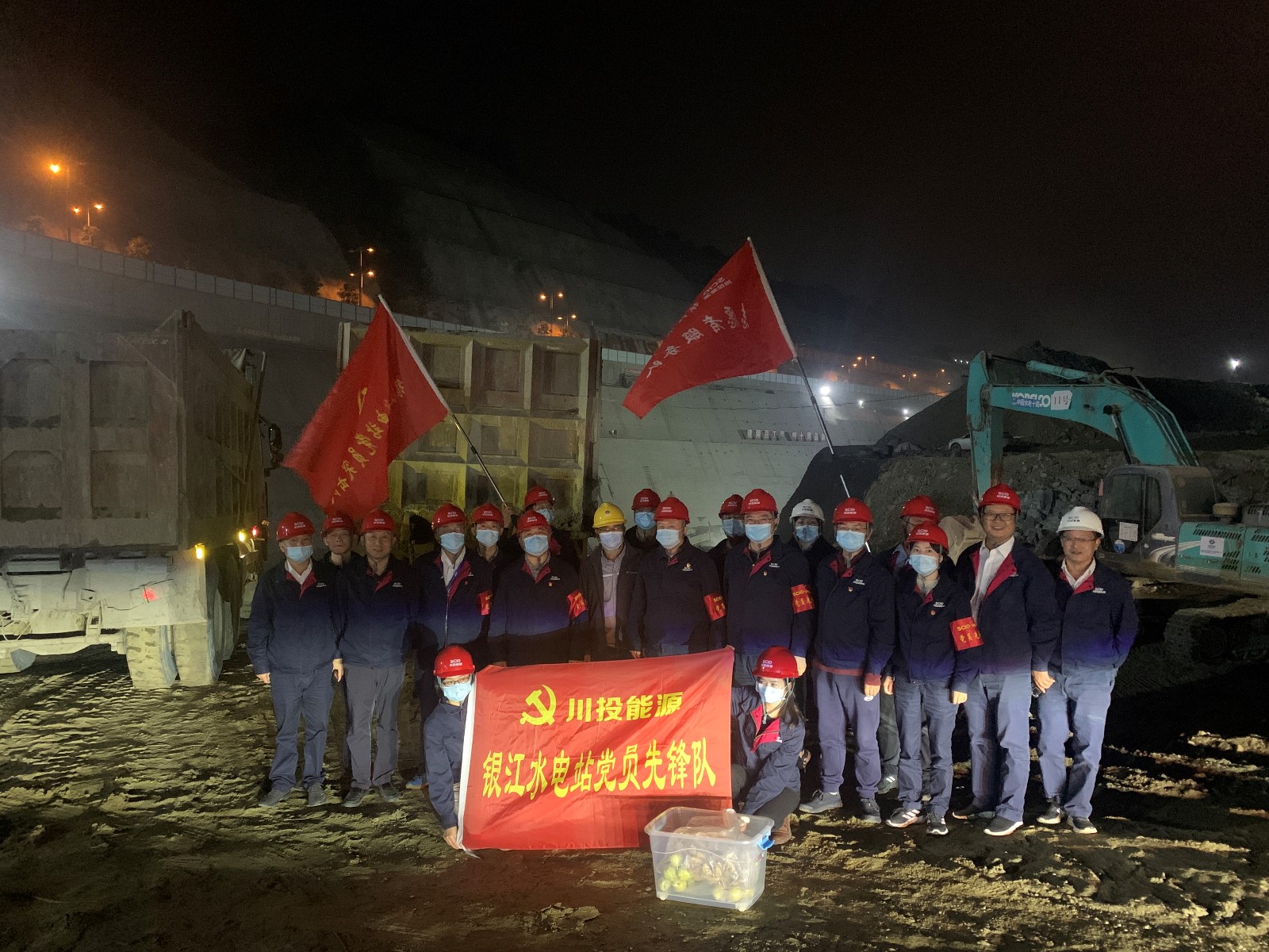 11月13日晚上22時,銀江水電站CIII標導(dǎo)流明渠項目工地上仍然燈火通明、機械轟鳴,為保障“11.30導(dǎo)流明渠過水”目標順利實現(xiàn),工人們正在挑燈夜戰(zhàn)、緊張有序施工。為堅決貫徹川投能源黨委“持續(xù)推進‘我為群眾辦實事’實踐活動”要求,確保大江截流目標如期實現(xiàn),攀水電公司工會聯(lián)合機關(guān)第二黨支部組織開展了“挑燈夜戰(zhàn)保截流,凝心聚力鼓干勁”主題黨日活動,組織支部黨員、入黨積極分子及志愿服務(wù)隊17人奔赴施工一線,為深夜仍在堅守崗位的施工及值班人員送上了熱騰騰、香噴噴的鹵雞翅、鹵蛋和香梨。攀水電公司黨總支委員、副總經(jīng)理吳巍嶼,黨總支委員、紀檢小組長、總經(jīng)理助理楊銳及總經(jīng)理助理唐伽帶隊開展活動。