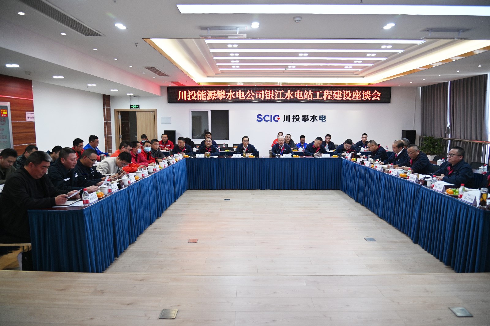 為全面總結2021年度工程建設情況,安排部署2022年度重點工作,加強與各參建單位在工程建設、服務合作等方面溝通交流,近日,公司組織召開了銀江水電站工程建設座談會,川投能源副總經理、公司黨總支書記、董事長徐孝剛,公司領導、各部門負責人及全體員工,各參建單位項目主要負責人等共計60余人參加會議,會議由公司黨總支委員、總經理吳巍嶼主持。