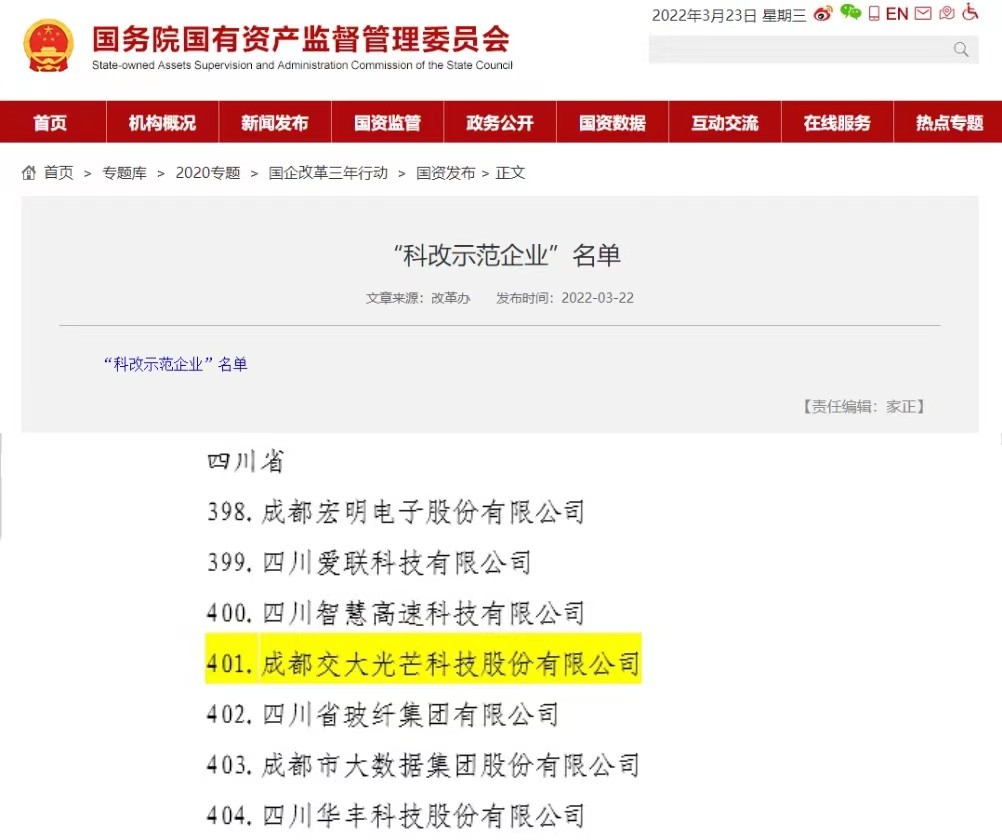 3月22日,國(guó)務(wù)院國(guó)資委網(wǎng)站公布《“科改示范企業(yè)”名單》,共440家企業(yè)納入“科改示范行動(dòng)”,交大光芒為四川省七家入選“科改示范企業(yè)”之一。