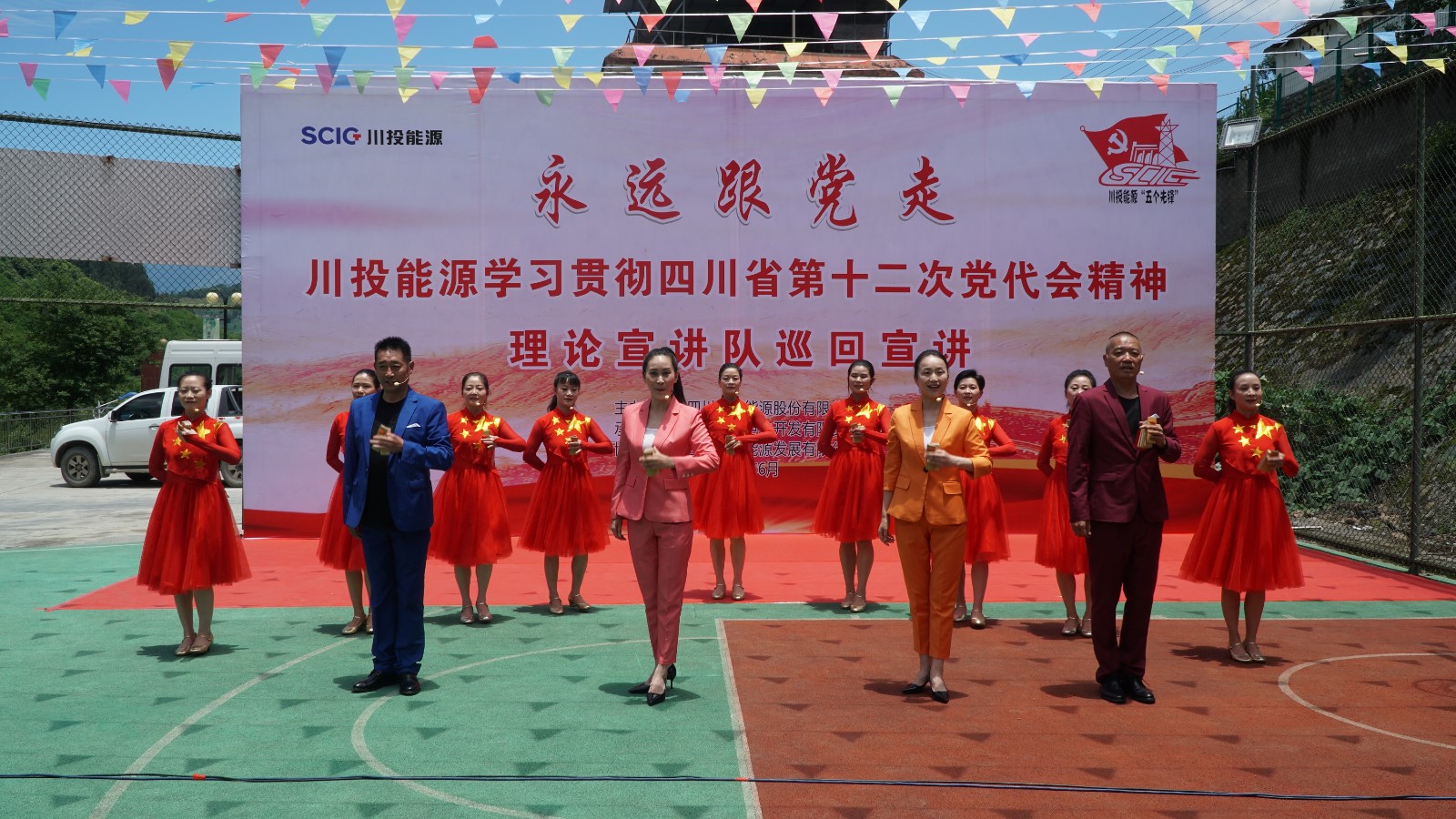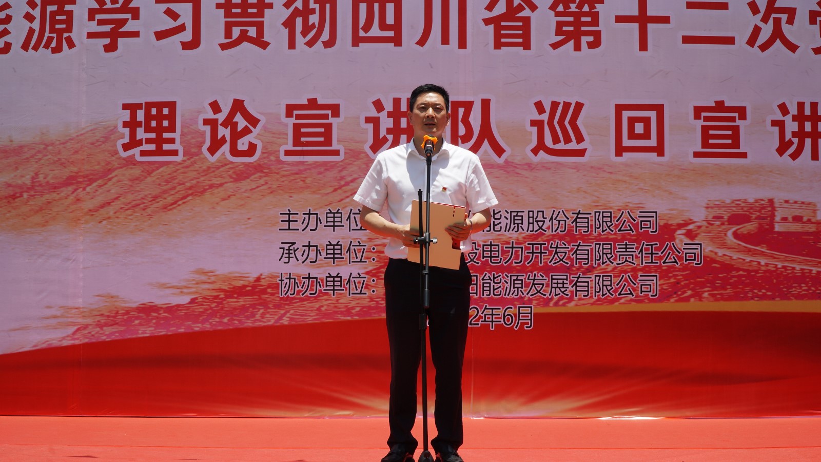 宣講在群山環(huán)繞、瓜果飄香、彩旗飄飄的電廠職工運動場拉開帷幕。在開場致辭中,冉蘭平代表川投能源黨委向默默堅守在甘洛縣玉田電廠的每一位干部職工表示感謝,也向電廠無私奉獻、艱苦奮斗,“舍小家為大家”的精神表示致敬。他指出,本次宣講旨在向電廠全體干部職工宣講習(xí)近平總書記來川視察重要講話精神和中國共產(chǎn)黨四川省第十二次黨代會精神,切實推動省十二次黨代會精神在基層落地生根。他要求,要學(xué)習(xí)領(lǐng)會好、宣傳宣講好、貫徹落實好省第十二次黨代會精神,將其作為當(dāng)前和今后一段時期重要政治任務(wù),進一步增強“四個意識”、堅定“四個自信”、做到“兩個維護”,為打造“國內(nèi)一流清潔能源上市公司”,推動治蜀興川再上新臺階不懈奮斗,以積極飽滿的實際行動和優(yōu)異成績迎接黨的二十大勝利召開。