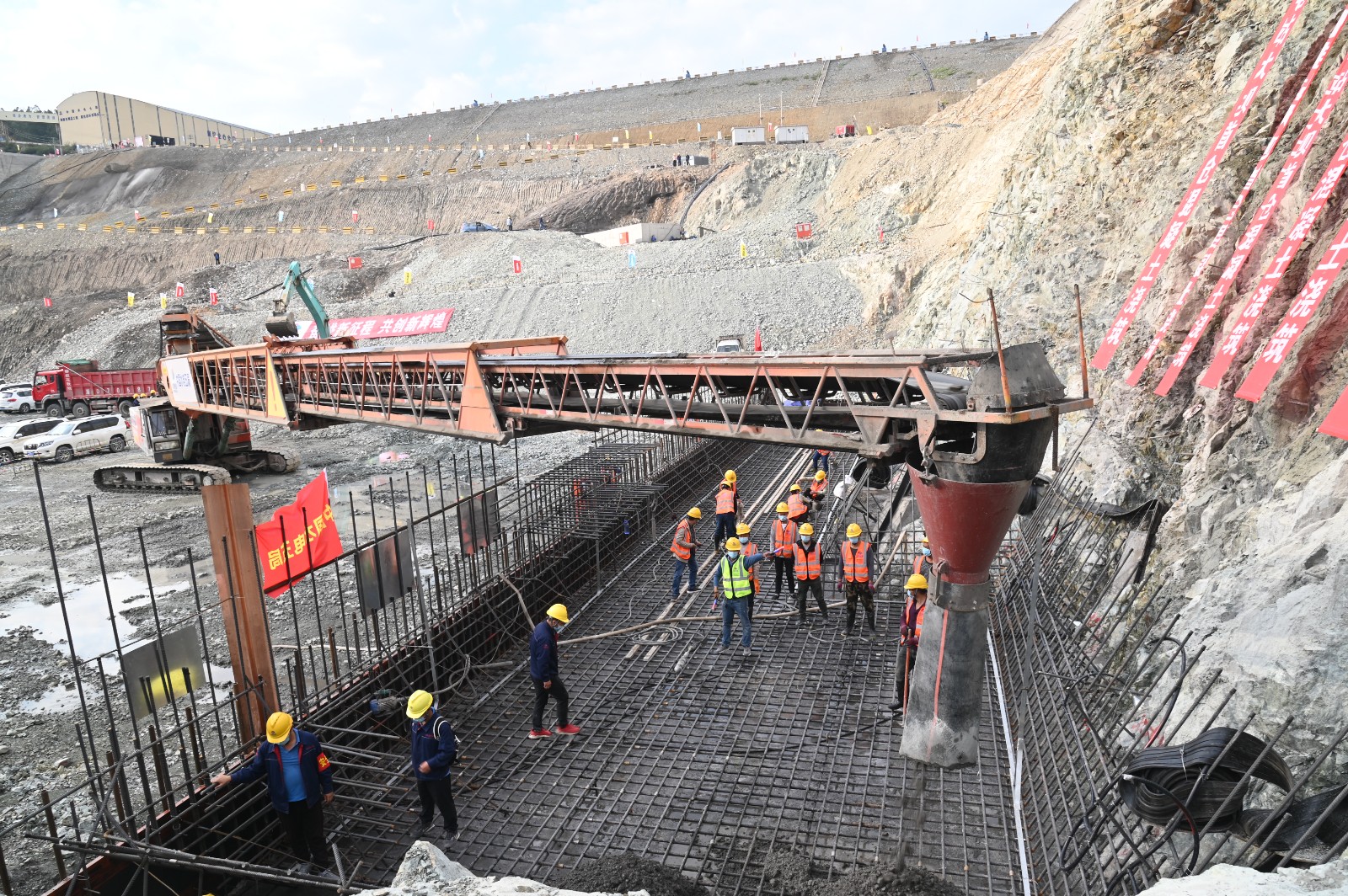攀水電公司根據工程建設實際情況,于9月下旬及時制定了“決戰四季度、大干一百天,力爭提前完成二期基坑開挖,加快主體工程施工,獻禮二十大”活動實施方案,成立了指揮部、6個工程推進組和7個活動保障組,組織召開了啟動會。在活動開展過程中,攀水電公司主要管理人員團結帶領各參建單位,每日召開生產協調會,黨員干部深入一線,及時解決現場問題,統籌組織施工資源,每日24小時不間斷進行二期基坑開挖,截止目前二期基坑即將開挖完成,安裝場、1#~4#機組段、廠壩導墻及消力池等部位已開始混凝土澆筑,較合同計劃12月澆筑大壩首倉混凝土的目標提前了30天。