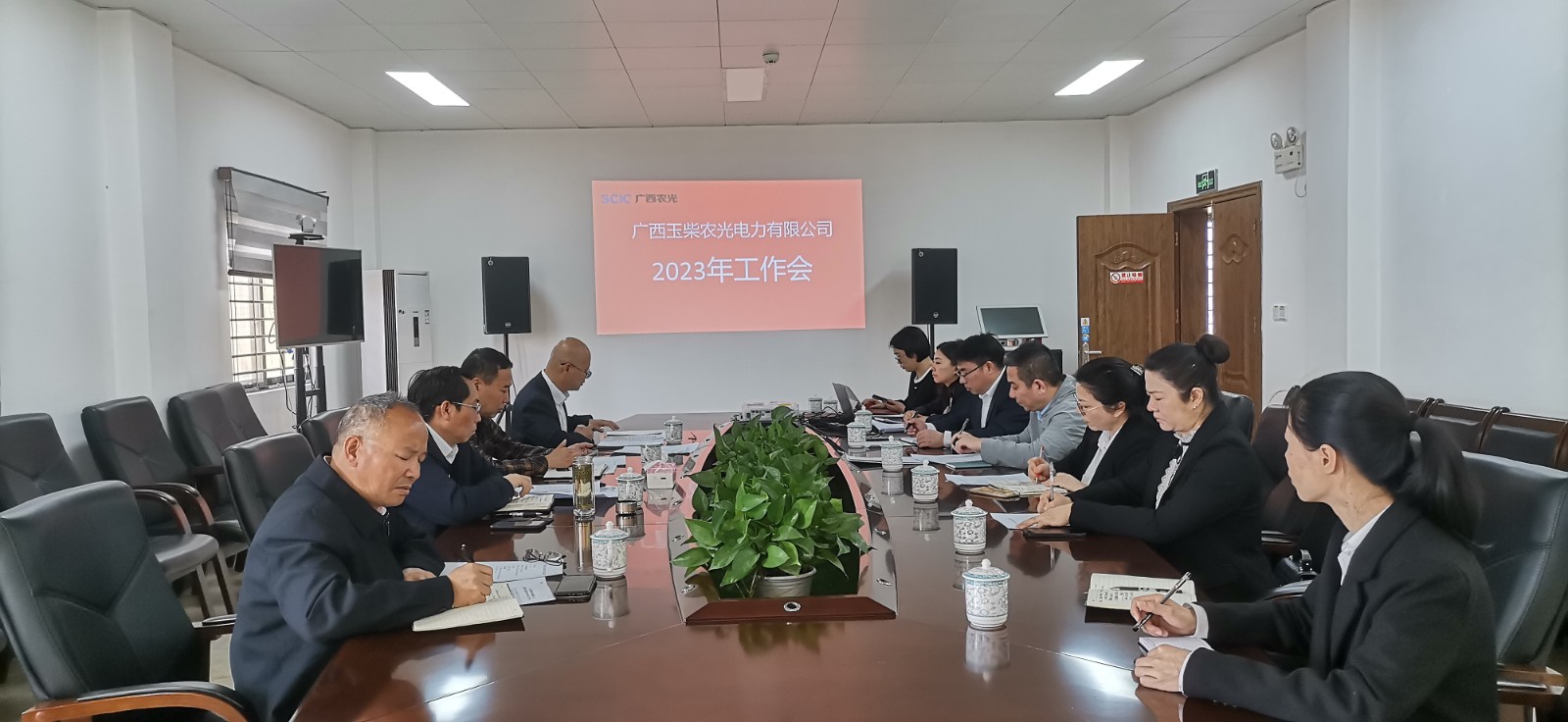 隨后,徐孝剛一行在桂平光伏電站升壓站二樓會(huì)議室召開了廣西農(nóng)光公司2023年工作會(huì),會(huì)議由攀新能源公司公司、廣西農(nóng)光公司財(cái)務(wù)總監(jiān)王俊森主持,公司全體員工(兼職)、運(yùn)維單位代表參加會(huì)議。會(huì)議學(xué)習(xí)傳達(dá)了川投集團(tuán)、川投能源、攀新能源公司2023年工作會(huì)精神;覃鳳荏作了廣西農(nóng)光公司《2022年工作總結(jié)及2023年工作計(jì)劃》的報(bào)告,重點(diǎn)匯報(bào)了2022年度主要指標(biāo)完成情況、主要工作舉措及成效、存在的問(wèn)題和困難以及2023年工作打算等;王俊森代表公司領(lǐng)導(dǎo)班子作廉潔從業(yè)公開承諾;公司主要領(lǐng)導(dǎo)分別與部門代表簽訂了2023年《“雙廉”責(zé)任書》《部門目標(biāo)責(zé)任書》。