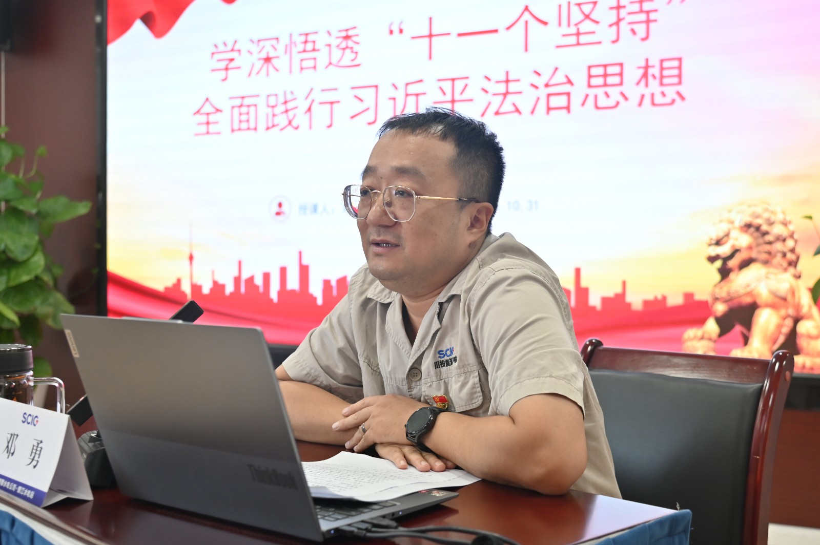 會上,公司黨總支副書記、董事會秘書、工會主席鄧勇以“學深悟透‘十一個堅持’,全面踐行習近平法治思想”為題,從習近平法治思想的核心理念、總體部署、關鍵舉措、重要成果四個方面做了系統闡述,詳細解讀了學深悟透“十一個堅持”的內在邏輯和豐富內涵,進一步深化了公司員工對習近平法治思想的理解和認識。