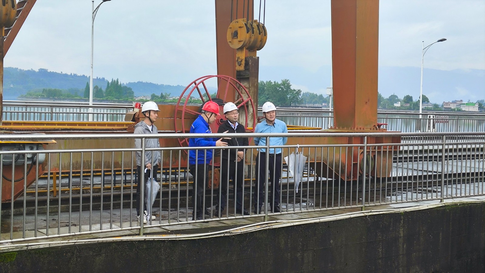 楊傳華一行實地察看電廠前池庫區、大壩、泄洪沖沙閘等工程,對防汛工作落實情況、應急預案修訂、監測預警與聯動、應急物資儲備工作情況進行檢查,并現場聽取電廠防汛抗旱責任落實、水庫調度管理、極端天氣防范應對措施等工作情況的匯報。
