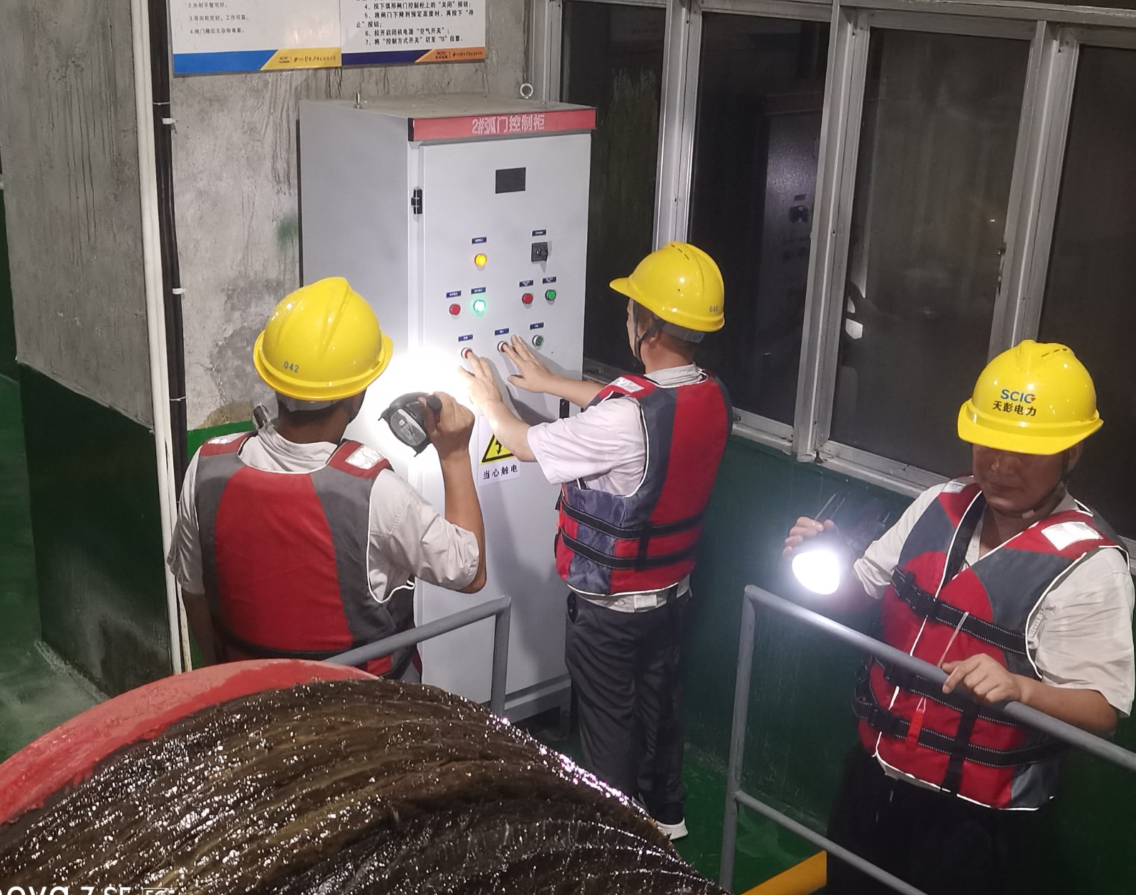 汛情就是命令,防汛就是責任,對于天彭電力人來說,這注定是個不眠之夜。公司領導現場指揮,及時處置各類突發情況,值班人員兵分三路、各司其職,一路駐守控制室,密切關注雨情、水情變化,作好信息收集和傳達;一路前往防汛重點部位進行巡視檢查,確保設備設施運行正常;一路做好應急搶險準備。