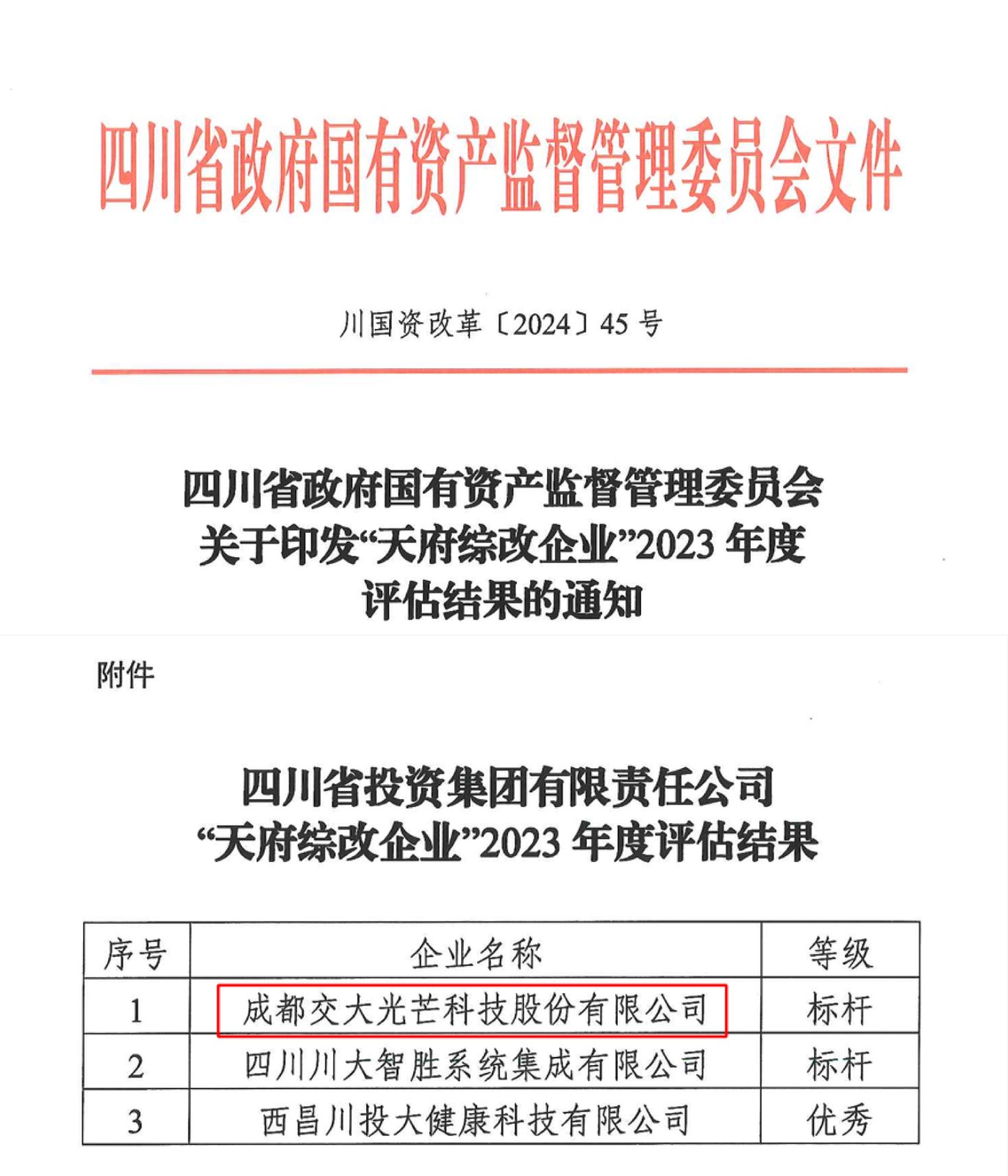 近日,四川省國資委印發“天府綜改企業”2023年度評估結果,交大光芒被評為A級(標桿)。此次評估由省國資委聘請獨立第三方機構進行,97戶“天府綜改企業”中被評為A級(標桿)的共22戶。