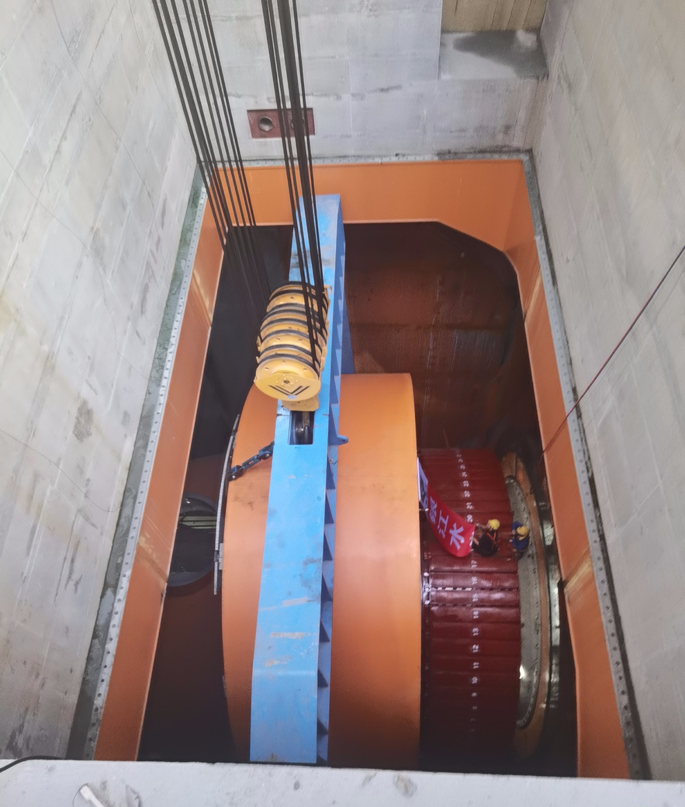 轉子與定子均是水輪發電機組核心部件,其裝配精度要求極高,本次吊裝過程堪稱機組安裝中技術最復雜、風險最高的環節之一;轉子總重約230.5噸,最大安裝直徑達8473.2毫米,由轉子支架、磁極、制動環及轉子引線等部件精密組裝而成;定子裝配則包括機座、內支撐、鐵芯、線棒等,總重190.5噸,機座最大外徑達10400毫米,總起吊重量高達約228噸;為確保這兩個大件的吊裝工作萬無一失,攀水電公司協同參建各方提前周密部署,對橋機制動系統、吊具及轉子、定子本體狀態開展全維度細致檢查,同步落實現場安全技術交底,完成起吊設備調試、操作流程演練等準備工作,夯實安全基礎。