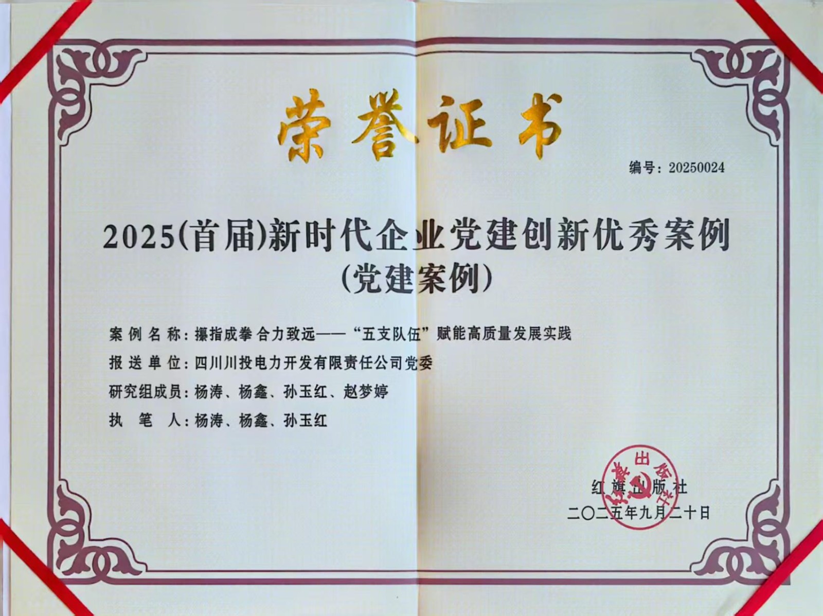 9月20日,由紅旗出版社主辦的2025(首屆)新時代企業黨建經驗交流會暨企業黨建創新優秀案例發布儀式在北京舉行。川投能源所屬川投電力黨委申報的案例《攥指成拳 合力致遠——“五支隊伍”賦能高質量發展實踐》,從1400余家企業中脫穎而出,成功入選本屆黨建創新優秀案例。