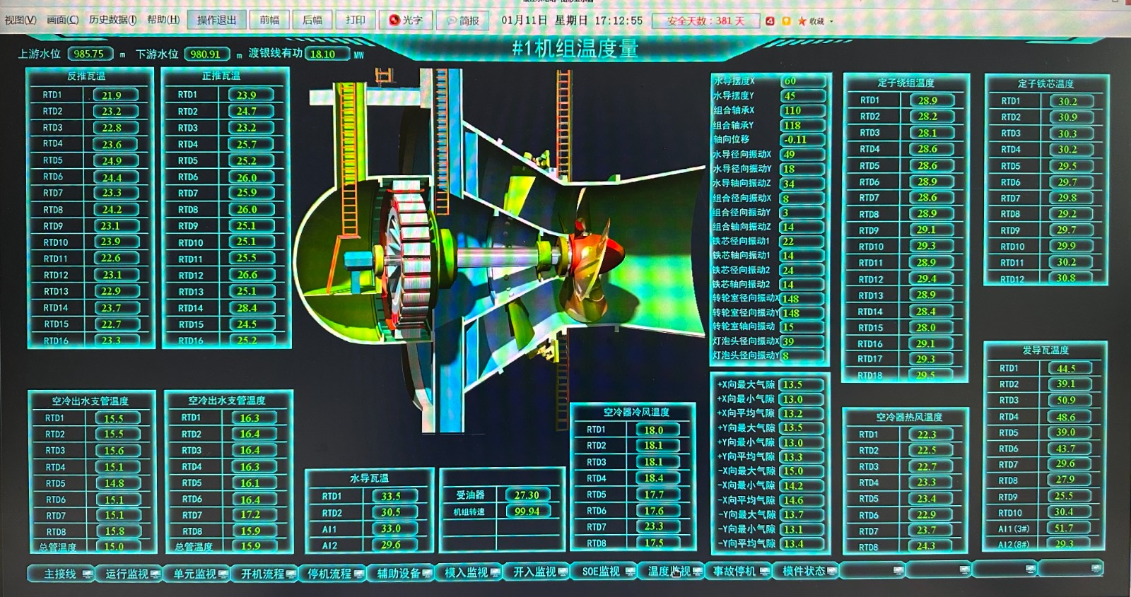 為全面掌握機組在低水頭下的性能表現,本次試驗重點圍繞兩大內容:一是6米至3米低水頭發電能力測試;二是3米以下水頭空轉工況泄水試驗。試驗前,公司專門成立了工程蓄水(三期工程擋水)指揮部,將低水頭試驗工作納入成立的九個工作小組中相應小組的工作職責,組織詳細評審了試驗大綱及應急預案;試驗過程中,工作人員實時監測機組出力、效率、振動擺度等關鍵指標,深入排查機組空轉穩定性及設備可靠性等風險,試驗過程嚴格執行水電站現場試驗規范,運用高精度監測設備,同步采集并分析了不同水位差下機組功率、導葉開度、水流流速、振動擺度及壓力脈動等多項參數,并成功定位機組振動區域。各機組依次完成不同水頭工況的切換與測試,全流程操作規范、數據完整,成功實現了機組最小發電水頭由6米降至3米的重要突破,標志著低水頭運行技術從研究階段進入具體應用階段。