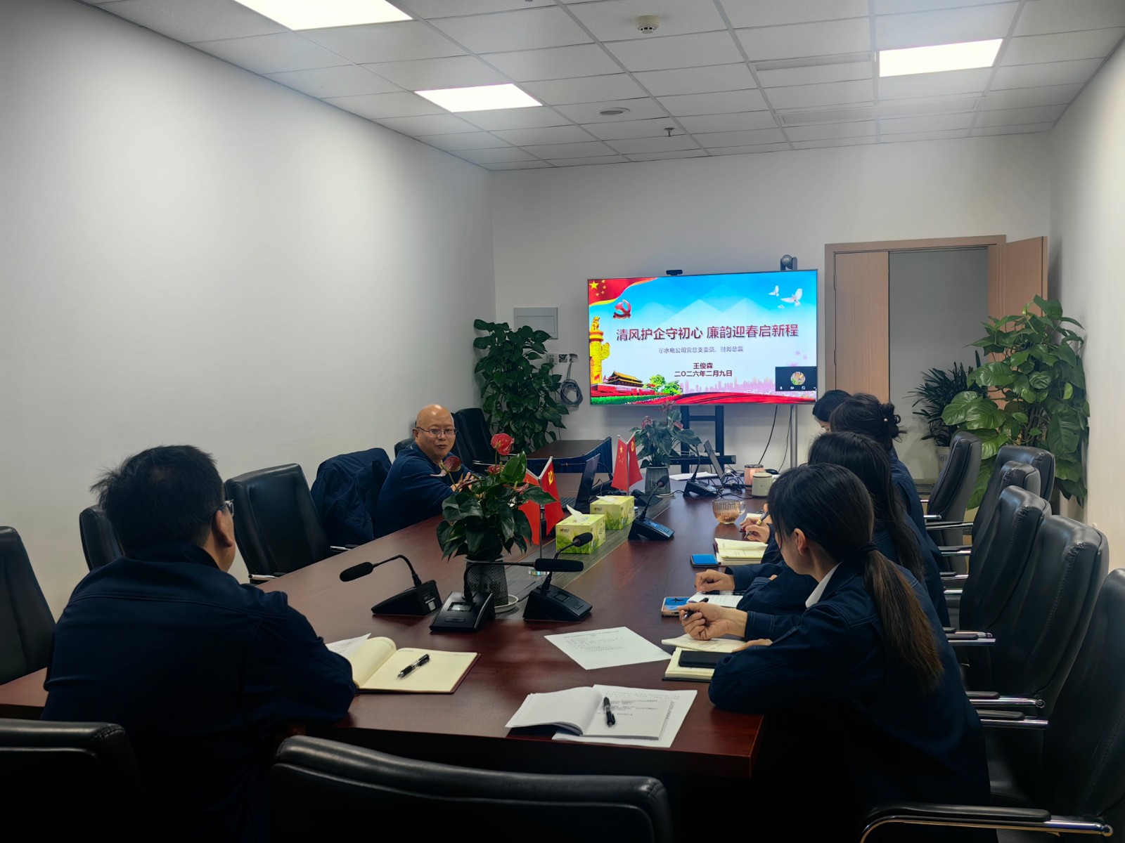 為進一步筑牢干部職工理想信念根基,強化全體員工廉潔自律意識與責任擔當精神,精準掌握基層職工思想動態、工作狀態與生活情況,2月9日,攀水電公司黨總支委員、財務總監王俊森以“清風護企守初心 廉韻迎春啟新程”為主題,在分管部門講授廉潔專題黨課,并同步開展2025年度組織生活會前談心談話。公司營銷發展部、資金財務部全體人員參加。