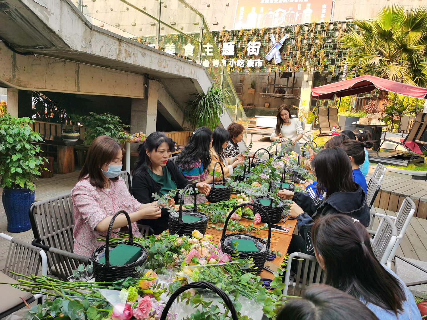 專業的花藝老師為大家講授了鮮花的選花、色彩搭配、造型、保鮮方法和插花技巧,大家自己精心設計后,一盆盆細致精美的插花作品逐漸完工。