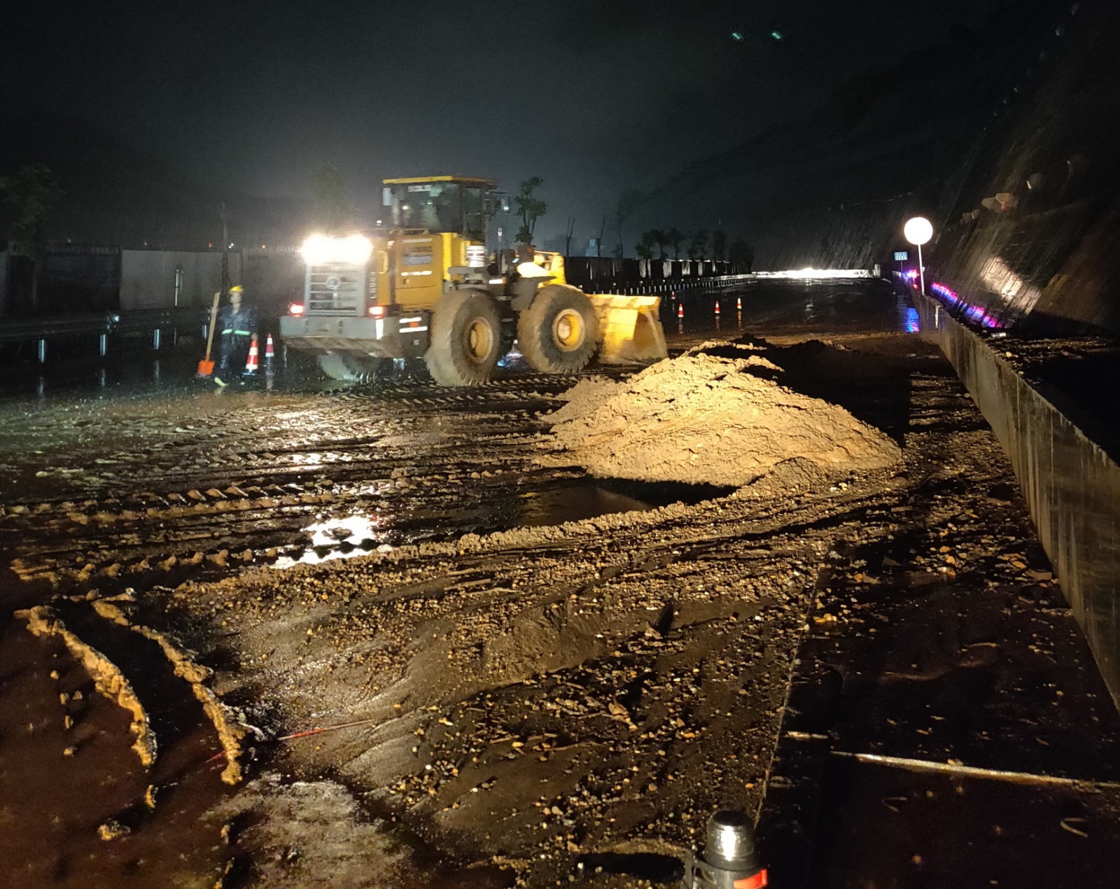 7月5日17時(shí)40分,攀枝花市地災(zāi)辦、防汛辦、氣象臺(tái)聯(lián)合發(fā)布山洪和地質(zhì)災(zāi)害預(yù)警信息,公司安全環(huán)保部第一時(shí)間傳達(dá)預(yù)警信息,當(dāng)晚公司防汛值班領(lǐng)導(dǎo)川投能源副總經(jīng)理、攀水電公司黨總支書記、董事長(zhǎng)徐孝剛帶領(lǐng)值班人員從8時(shí)到11時(shí)進(jìn)行防汛值班檢查,對(duì)各值班點(diǎn),重要部位巡視,當(dāng)晚21時(shí)45分,22時(shí)15分攀枝花氣象臺(tái)分別發(fā)布雷電黃色預(yù)警、暴雨黃色預(yù)警。攀水電公司組織各參建單位按照防洪度汛工作要求,冒雨開展雨中巡查,對(duì)渣場(chǎng)、導(dǎo)流明渠,銀江大橋、砂石拌和系統(tǒng)等重要部位及施工區(qū)域進(jìn)行全面排查。當(dāng)晚23點(diǎn)左右,值班人員雨中巡查,發(fā)現(xiàn)暴雨導(dǎo)致轉(zhuǎn)沱溝邊坡上方工業(yè)園區(qū)內(nèi)部分棄渣被沖刷到G227國(guó)道,嚴(yán)重影響道路的正常通行,本著國(guó)企社會(huì)責(zé)任,公司防汛防災(zāi)帶班領(lǐng)導(dǎo)徐孝剛立即安排二灘監(jiān)理、葛洲壩路橋組織機(jī)械設(shè)備及人員進(jìn)行清理,于次日凌晨3點(diǎn)左右清理完畢,確保了G227國(guó)道的正常通行。