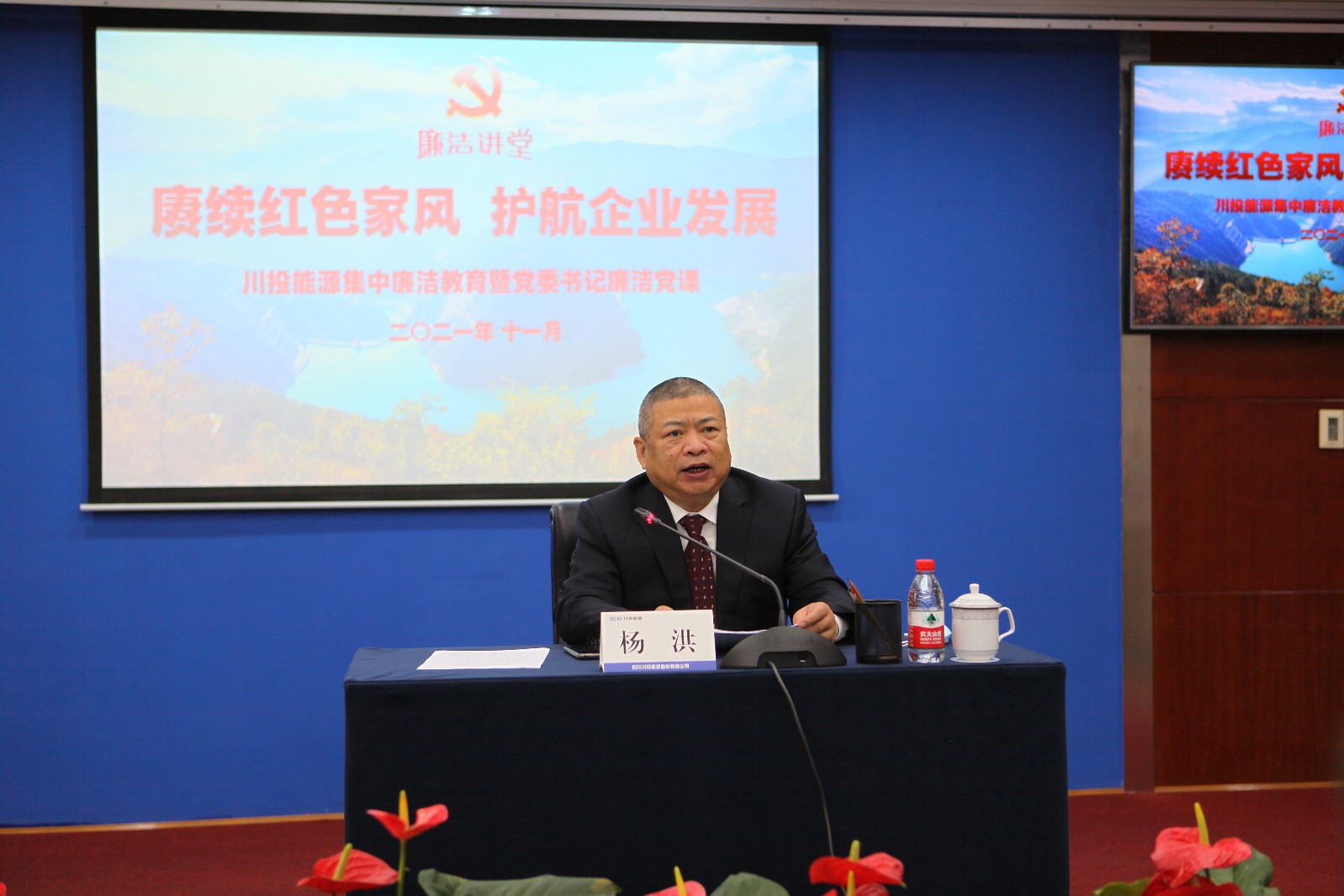 為貫徹落實中央關于全面從嚴治黨部署和要求,切實推進公司黨風廉政建設,推動“好風傳家”工作落實落細,2021年11月25日上午, 川投能源黨委組織召開了2021年集中廉潔教育會,公司黨委書記、副董事長、總經理楊洪以“賡續紅色家風,護航企業發展”為題給公司黨員干部講授廉潔黨課,并組織觀看了由中央紀委國家監委宣傳部、中央廣播電視總臺聯合制作的電視專題片《正風反腐就在身邊》之《嚴正家風》。公司黨委副書記、工會主席冉蘭平主持會議。